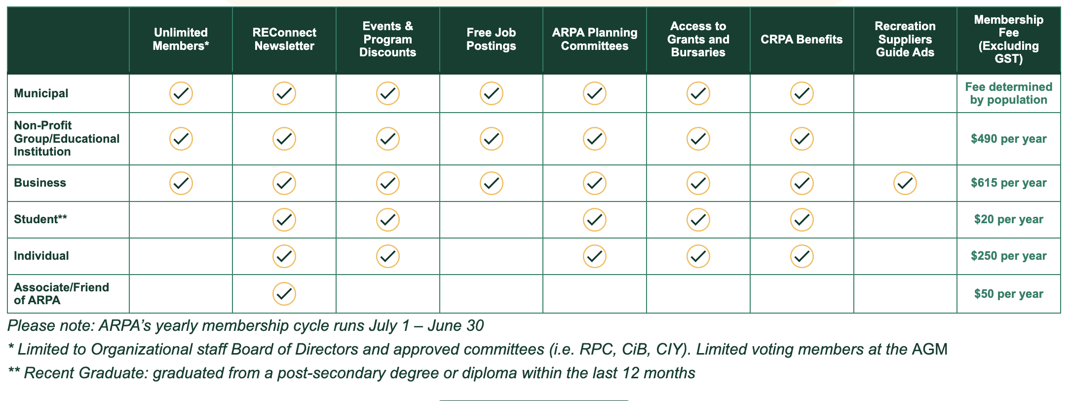 Membership BenefitsBecome a Member Today!Did you know, our members represent more than 87% of Alberta’s municipalities?Join an established, connected, and passionate community of recreation and parks professionals. Being a member of the Alberta Recreation & Parks Association (ARPA) is being part of a bigger family. As the hub for all things recreation and parks, the ARPA membership community is made up of diverse recreation and parks professionals who are working together to build healthier and more engaged communities! As a member of ARPA, not only will you receive access to our educational and networking events like the annual ARPA Conference & Energize Workshop or Parks Forum, you will also be able to stay connected to your peers, be on top of relevant industry trends, and become aware of resources and opportunities meant to enhance your role as a recreation and parks professional. Are you interested in the recreation and parks sectors’ role in reconciliation? As a member of ARPA, you will be able to walk that journey with us as we continually expand our own role in allyship. Visit our Walking With Indigenous Communities page to learn more! MUNICIPALstarting at